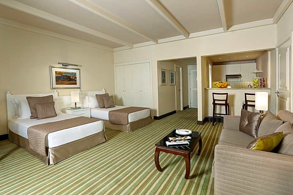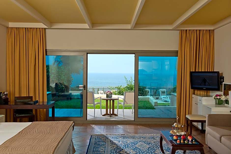 Located on the 2nd floor, this air-conditioned 60 sqm room is fitted with a desk and a queen size bed or twin beds.The room offers spectacular views of the Mediterranean Sea. The unit has a sitting area with a small sofa.